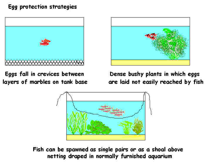 The spawning tank should be furnished with plenty of bushy plants in which the female can hide if necessary, but in most cases it is best to remove her from the spawning tank as soon as possible after spawning has been completed.