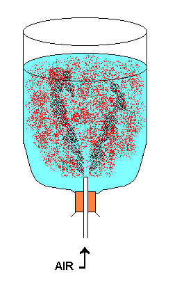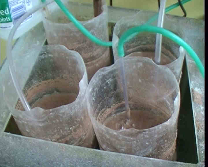 Brine Shrimp hatchers made from inverted, cut-down lemonade bottles.
